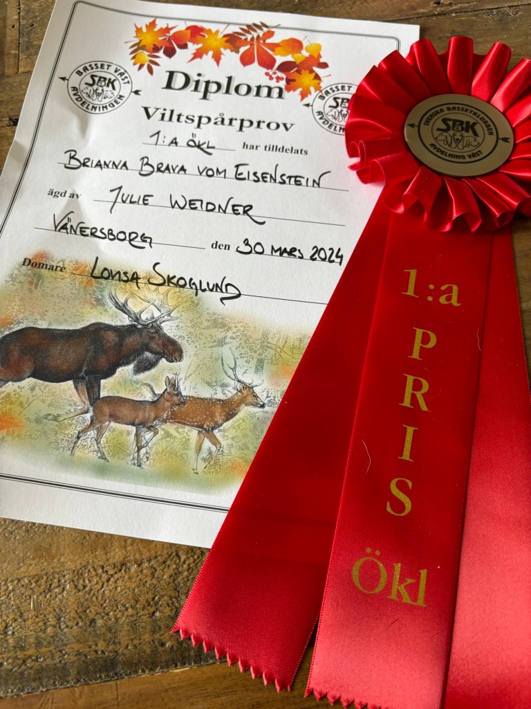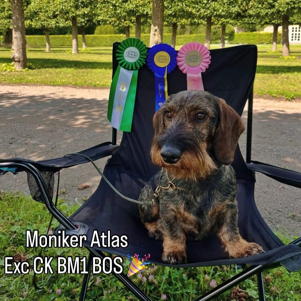 Moniker Atlas “Thorleif” and owner Jenny were at the exhibition today for the Östsvenska taxklubben. We are happy to report that Thorleif won the hunting class and was the only male with Exc and CK today and earned the CERT. Icing on the cake was earning Best Opposite Sex (BOS/BIM) to end the day.