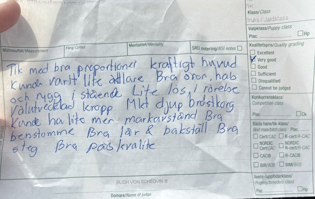 2025.08.30-Today was sister Sophie’s day to be “Very Good.”🥈Sophie has been sitting home and working on her hunting skills while her siblings were in the show ring. Today she and I went to an exterior bedömning hosted by the Halland Kennel club. Sophie had happy feet on the damp grass, but overall did well and got a very nice critique. ☺️ We will spend a bit of time in the coming week preparing for more grass walking instead of jogging, and hopefully get excellent next time around.💖
