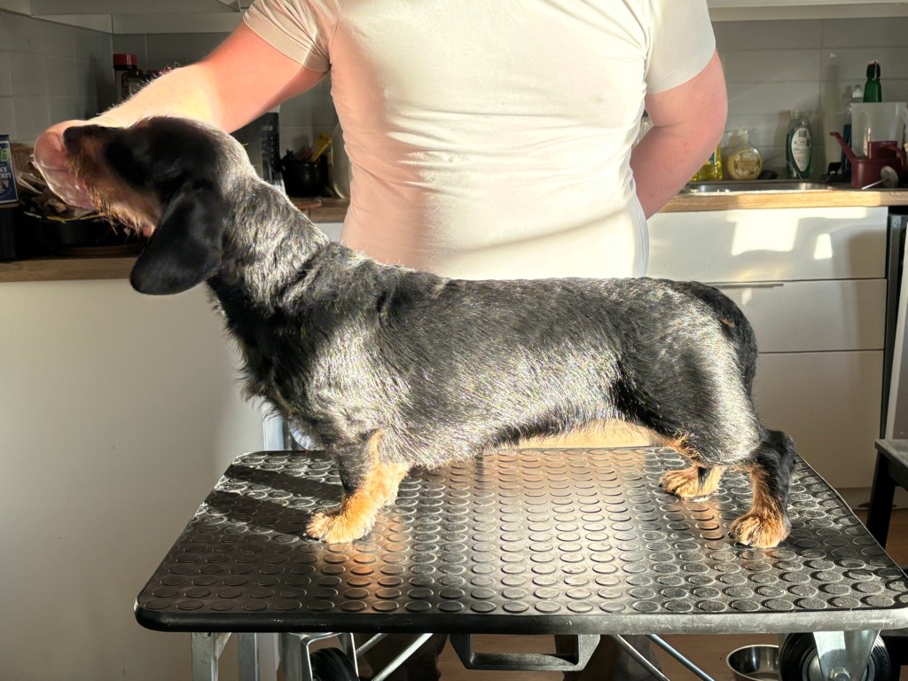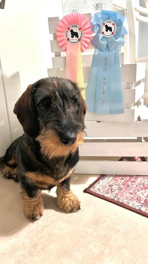 Due to a hunting incident, she had to have a partial tail amputation. Thus, we won’t be showing in Sweden, however, we plan to track, do underground training and get her situated in our home. Hopefully in the future we will also be able to incorporate her into our breeding program.