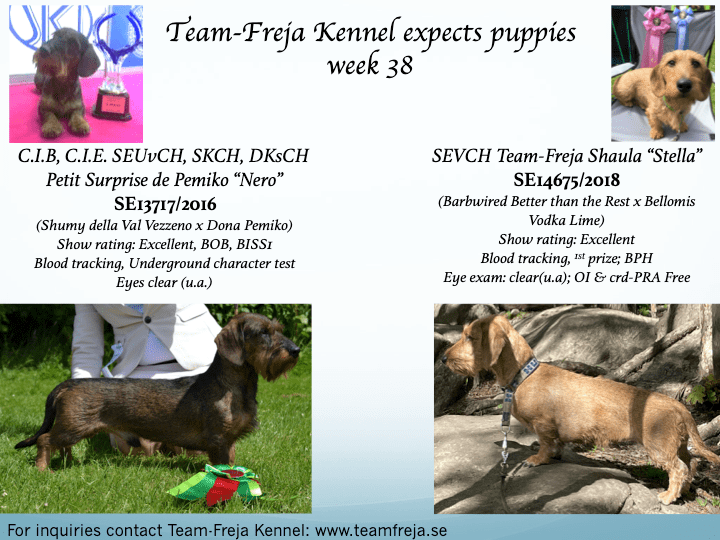 We expect puppies in wild boar and/or red color born week 38. For more information on the upcoming litter, contact Thomas and Carina Hofling at Team-Freja kennel here.