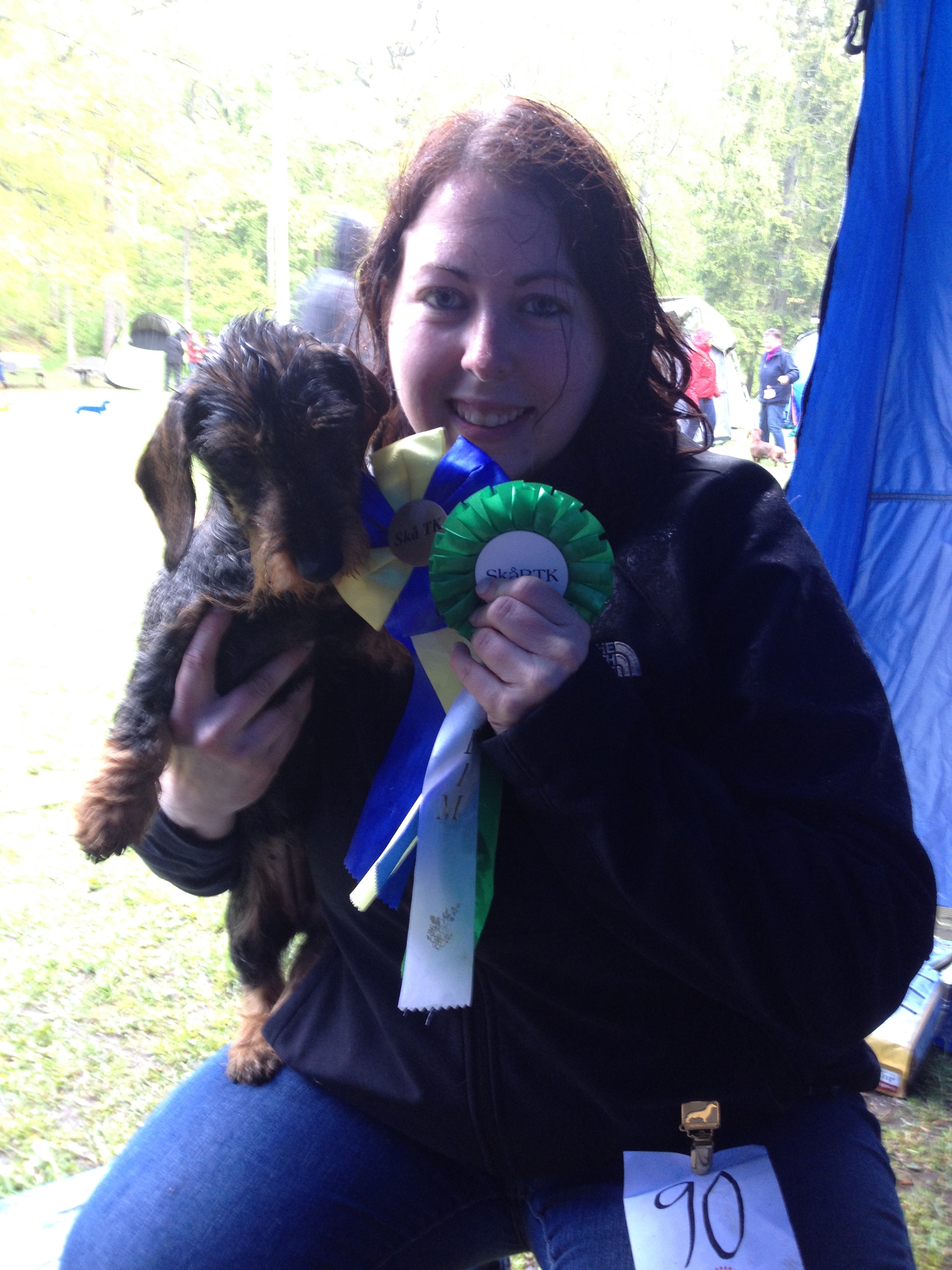 Although we are a new, small kennel, we have big aspirations. I breed by the FCI standard and prefer the “old European type”. I firmly believe that a dachshund is an all-around dog. If the dog has no hunting instinct and is “only” a show dog, it isn’t for me. Sticking to this, all of my dogs have been tried in multiple trials around Europe above and below ground. Additionally, all of our dogs are Blood tracking Champions and both boys have passed underground tests on badger here in Sweden. Liina has trained on badger and fox and shows great promise and will be tested in the future. I am also very keen on underground tests with the dogs as they were developed to be underground hunters. These tests also challenge the size of the dogs as there is always a narrow point (in Sweden it is 15x17cm), so the dog cannot be too big in order to enter the den. Form should always follow function. All that being said, a working dog can also be beautiful. I strive to breed and develop healthy dogs that can do it all and go from sofa to forest to show effortlessly.
